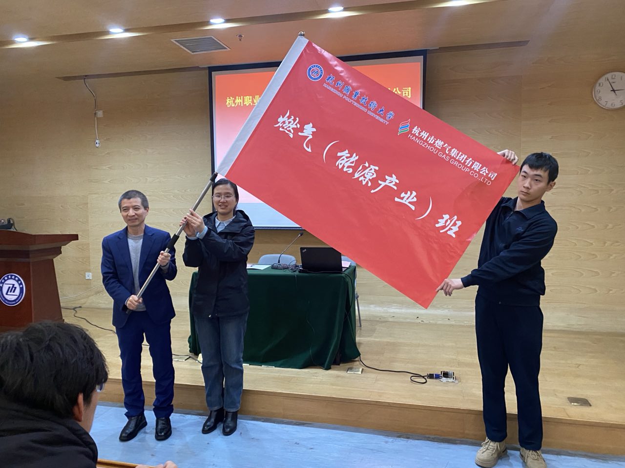 3月18日下午,杭州职业技术大学与杭州市燃气集团有限公司联合举办的第五届“燃气(能源产业)班”开班仪式,在图书馆第六会议室举行。杭燃集团党群工作部(人力资源部)副经理杨竹莹应邀出席,特种设备学院副院长陈军统、智能机电技术专业负责人孟伟、机电专业24级班主任、第五届燃气(能源产业)班全体学员及校友代表等参加典礼。开班仪式由陈军统主持。