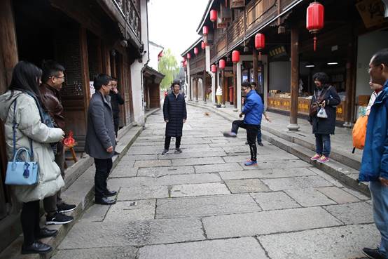 之后老师们又乘船游览了鉴湖、柯岩美景,欣赏了绍兴的湖光山色。半路上老师们还乘兴在鲁镇的石板路上踢毽子、滚铁圈,回味童时的记忆。