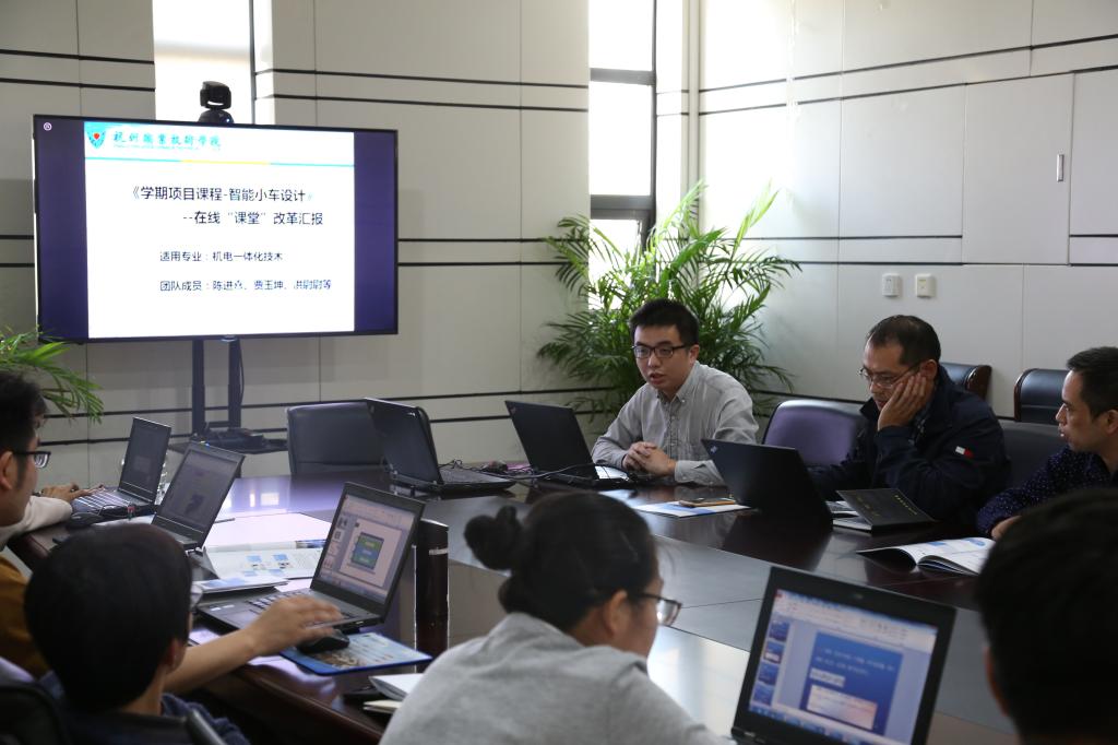分院要求专业组经过前期讨论,明确每个专业要建设的重点课程,电梯专业推出了电梯检测技术、PLC液压气压控制、电扶梯控制技术课程、电梯结构与原理;机电专业推出了智能小车设计、三维造型软件应用、电路与电机课程。围绕“怎么改、改什么、用什么方法改、能达到什么效果”,七名课程建设负责人介绍了各自的课程建设思路。各位老师经过精心设计准备,从课程的不同特点入手,重点介绍了在线课程的使用思路,方法及预期的成效。