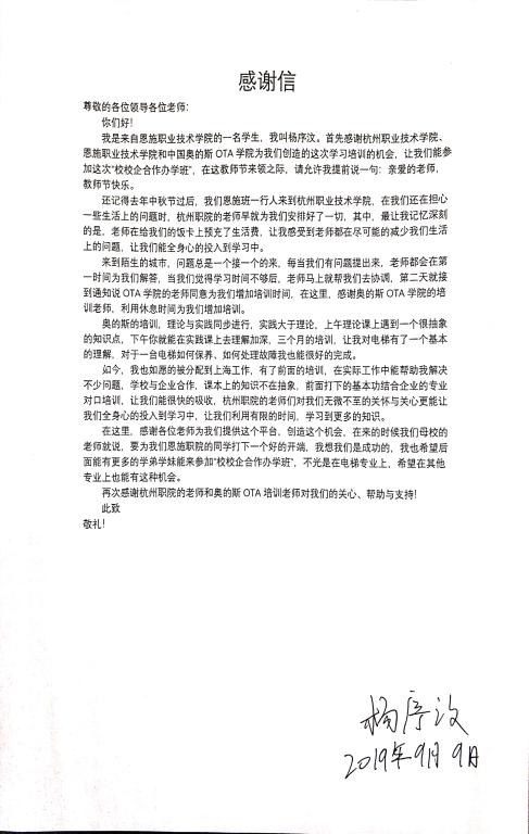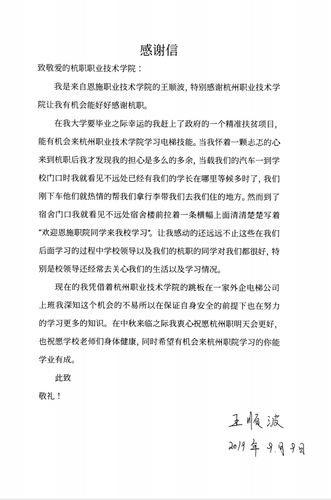 新学期开学的第一天,学院收到了来自“校校企恩施电梯班”毕业学生的感谢信:感谢我校为恩施学生提供了学习专业技能的平台;感谢杭职院的教师和OTIS的师傅默默无闻无私的付出;感谢学校和企业为他们提供合适的工作岗位。