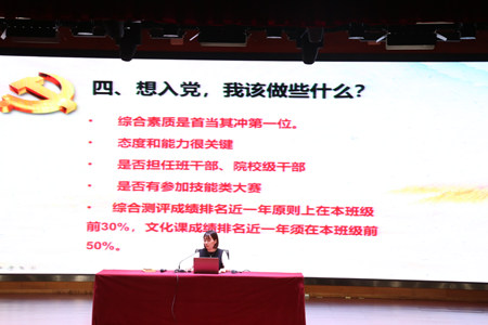 会上,傅淑燕就为什么要开展入党启蒙教育、青年学生为什么要入党、想入党,我该做些什么、入党流程及材料准备和入党申请书怎么写五个方面进行了仔细的介绍。希望同学们及时树立正确的入党动机,端正入党态度,在实践中不断用切身体验来深化对党的认识,做政治素质和专业素质的先进分子,尽快从思想上、行动上向党组支部靠拢,早日成为中国共产党的一员。