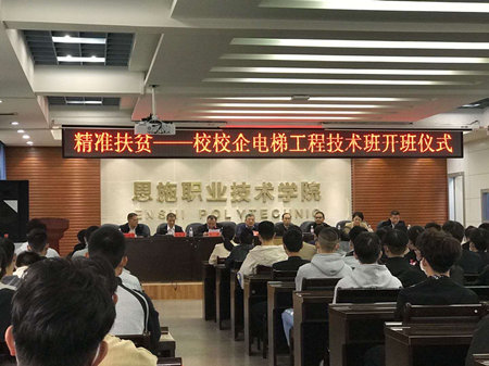 10月14日上午,杭州市对口帮扶恩施州精准扶贫工程的杭州职业技术学院对口帮扶、支持恩施职业技术学院建设、发展的项目之一,2020年“精准扶贫——校校企电梯工程技术班”在恩施职业技术学院举行。杭州市政协副主席、杭州市中华职教社主任周智林带领杭州市卫健委医政处副处长管伟华,我校特种设备学院副院长陈军统,杭州西奥电梯有限公司人力资源部经理王玉云一行10人,恩施州政协副主席张全榜,恩施州政府副秘书长姚洪华,农工党恩施州委主委杨德华,恩施职业技术学院校长张捷,副校长吴云及相关部门负责人、教师代表和全体33名学生出席本次开班仪式。仪式由恩施职业技术学院副校长吴云主持。
