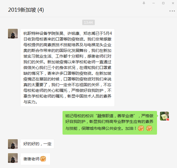 5月7日中午,特种设备学院收到了来自新加坡实习就业学生的感谢信。信中写到:“杭职特种设备学院学生张昊、许铭康、郑志禹已于5月6日收到母校寄来的口罩等防疫物资。我们非常感激母校提供的高素质技术技能培养及与电梯龙头企业奥的斯合作带来的的国际化发展舞台,我们在新加坡实习就业生活、工作都十分顺利,感谢老师们对我们的关怀。新加坡疫情以来学校和老师一直通过微信关心我们三个的身体状况,在得知我们口罩紧缺的情况下,寄来许多口罩等防疫物资。在新加坡疫情还在蔓延的时候,口罩等防疫物资对我们来说真的太重要了,我们一定会不忘祖国的关怀,不忘母校和老师的关心和嘱托,严格做好自我防护,不辜负学校和老师的嘱托,彰显中国技术人员的素养与实力。”
