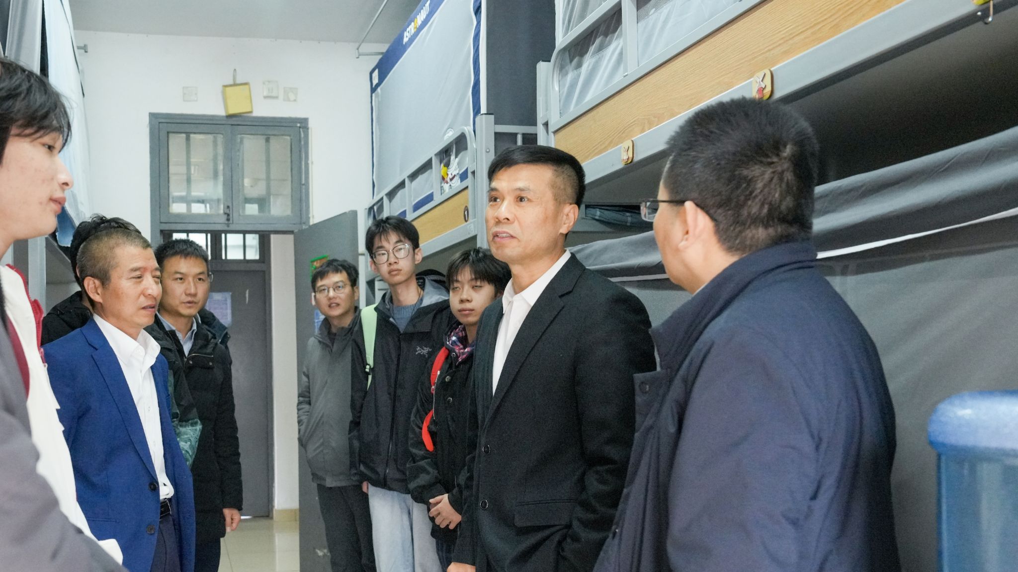 饭后,黄兆信前往学生宿舍楼,走访学生寝室,察看宿舍环境、消防设施、洗漱条件等,触摸被褥厚度,询问作息时间。他强调,宿舍既是生活场所,也是成长空间,叮嘱同学们要自觉遵守宿舍管理规定,保持规律作息,注意用电与消防安全,共同维护整洁、文明、有序的居住环境。他勉励同学们勤奋学习、锻炼身体,遇到困难及时向学院和学校反映。他表示,学校始终将学生冷暖放在心上,将持续改善条件,为大家创造更好的学习生活环境。