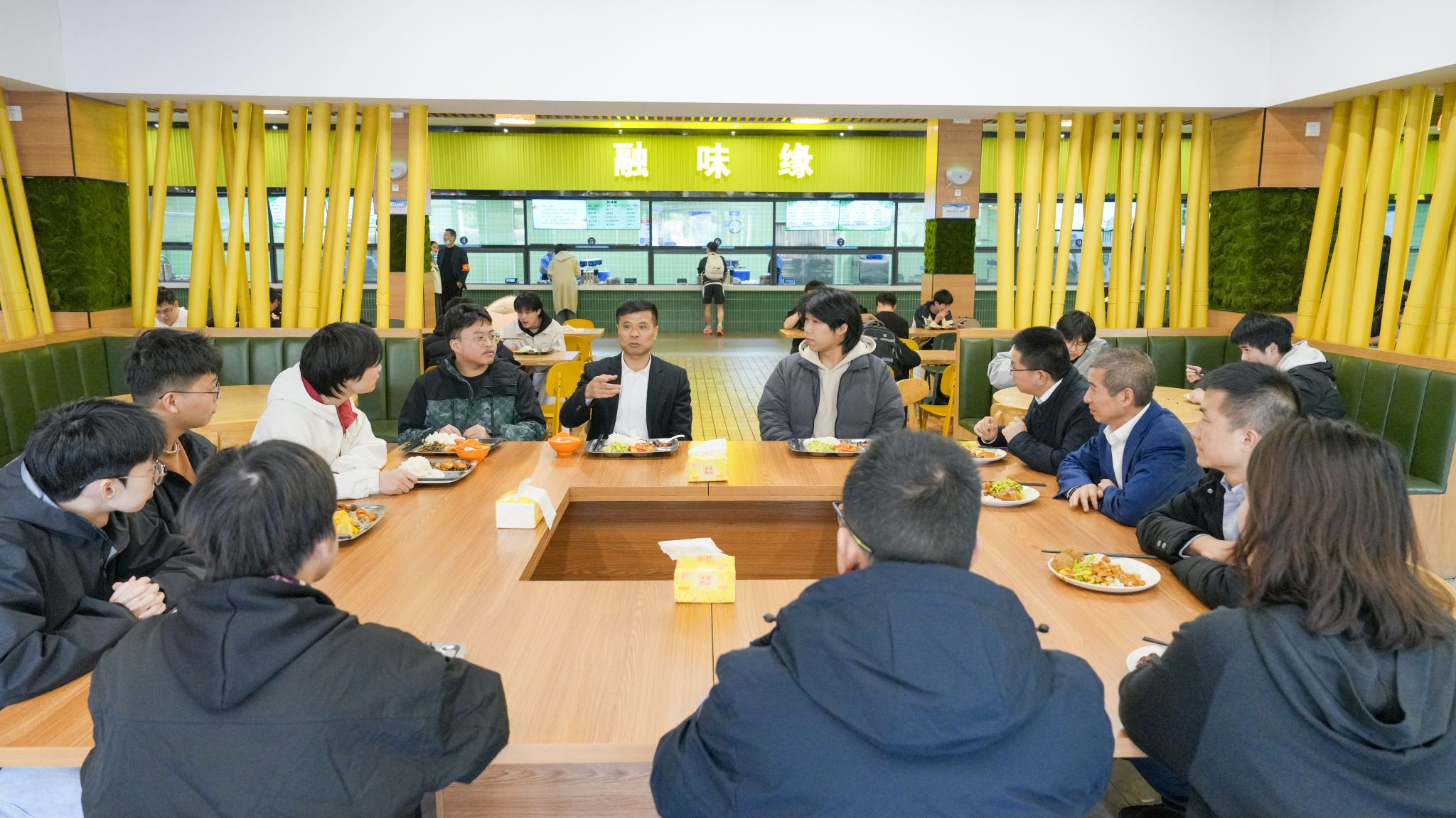 午餐时分,黄兆信与同学们围坐一桌,在饭菜蒸腾的热气中亲切交谈。他仔细询问同学们近期的学习和生活情况,与同学畅聊人工智能技术运用、身体锻炼方法、学生社团活动等。对于同学们在学业发展、职业规划、日常生活等方面的困惑,他也一一解答。