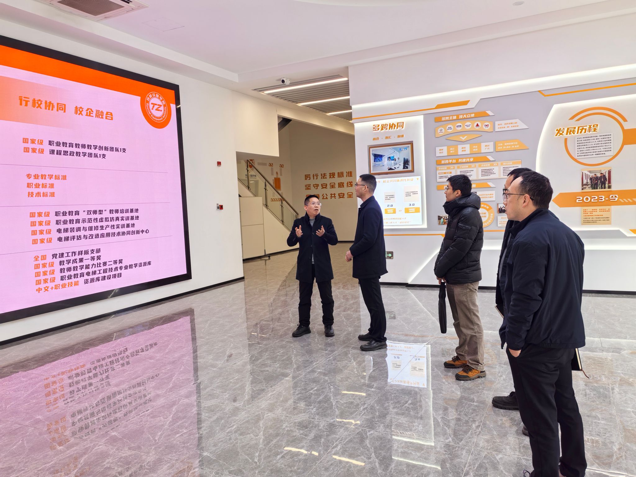 郭伟刚陪同来宾实地考察了电梯实训基地,参观了电梯控制实训室、虚拟仿真体验中心、电梯保养与维修中心等功能区域,介绍了“教室即井道、井道即教室”的教学模式、小班化教学组织形式以及“温暖工程”等育人实践,展现了真实岗位环境与数字化教学相结合的教学特色。