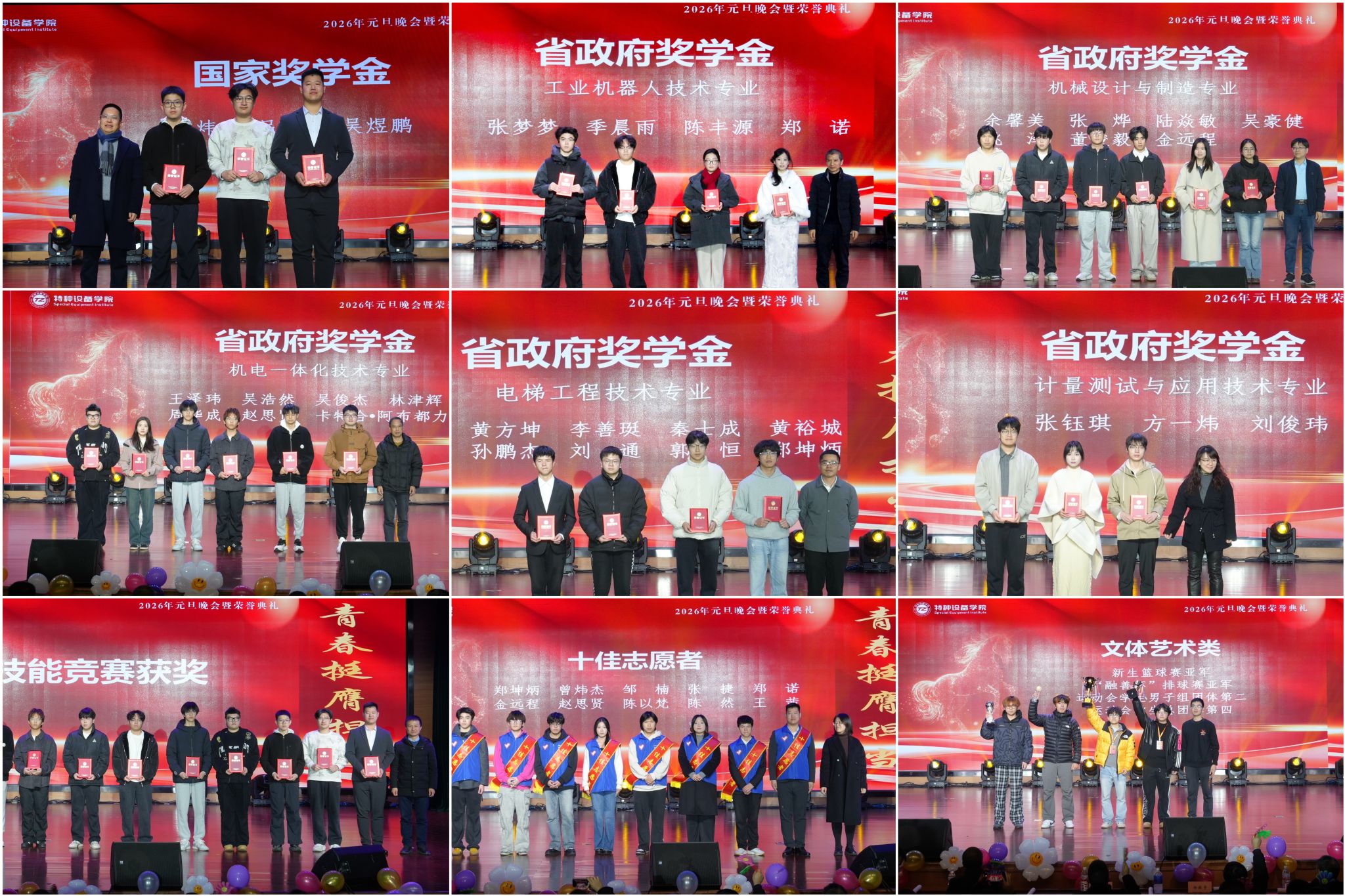 随后,“荣耀时刻”颁奖环节隆重举行。国家奖学金、省政府奖学金获得者,技能竞赛获奖学生,以及十佳志愿者、文体艺术获奖者代表依次登台领奖。熠熠奖章见证拼搏,阵阵掌声礼赞成长。国家奖学金获得者、学生代表曾炜杰分享了自己退役复学后的成长经历,鼓励同学们敢于尝试、勤于耕耘,在奋斗中擦亮青春底色。他的发言真挚动人,引发了现场师生的共鸣。