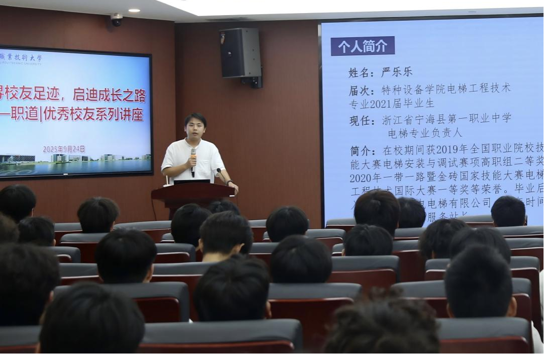 9月24日下午,我校特种设备学院电梯工程技术专业2021届优秀校友、现任宁海县第一职业中学电梯专业负责人严乐乐重返母校,为师生带来了一场题为《在方寸梯间,筑人生高度》的精彩讲座。学工部副部长张园园,特种设备学院分管学生工作副书记雷阳,学工办主任、辅导员及百余名同学共同参加。