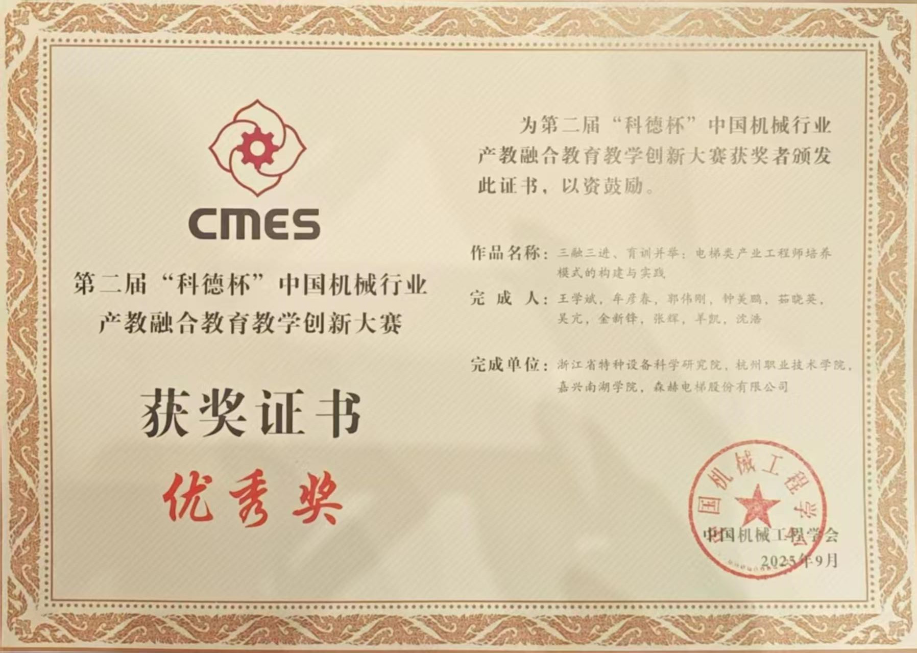 9月19日至22日,第二届“科德杯”中国机械行业产教融合教学创新大赛全国总决赛在广州举行。我校与浙江省特种设备科学研究院联合申报的《三融三进、育训并举:电梯类产业工程师培养模式的构建与实践》项目荣获企业组优秀奖(一等奖),跻身全国六强。