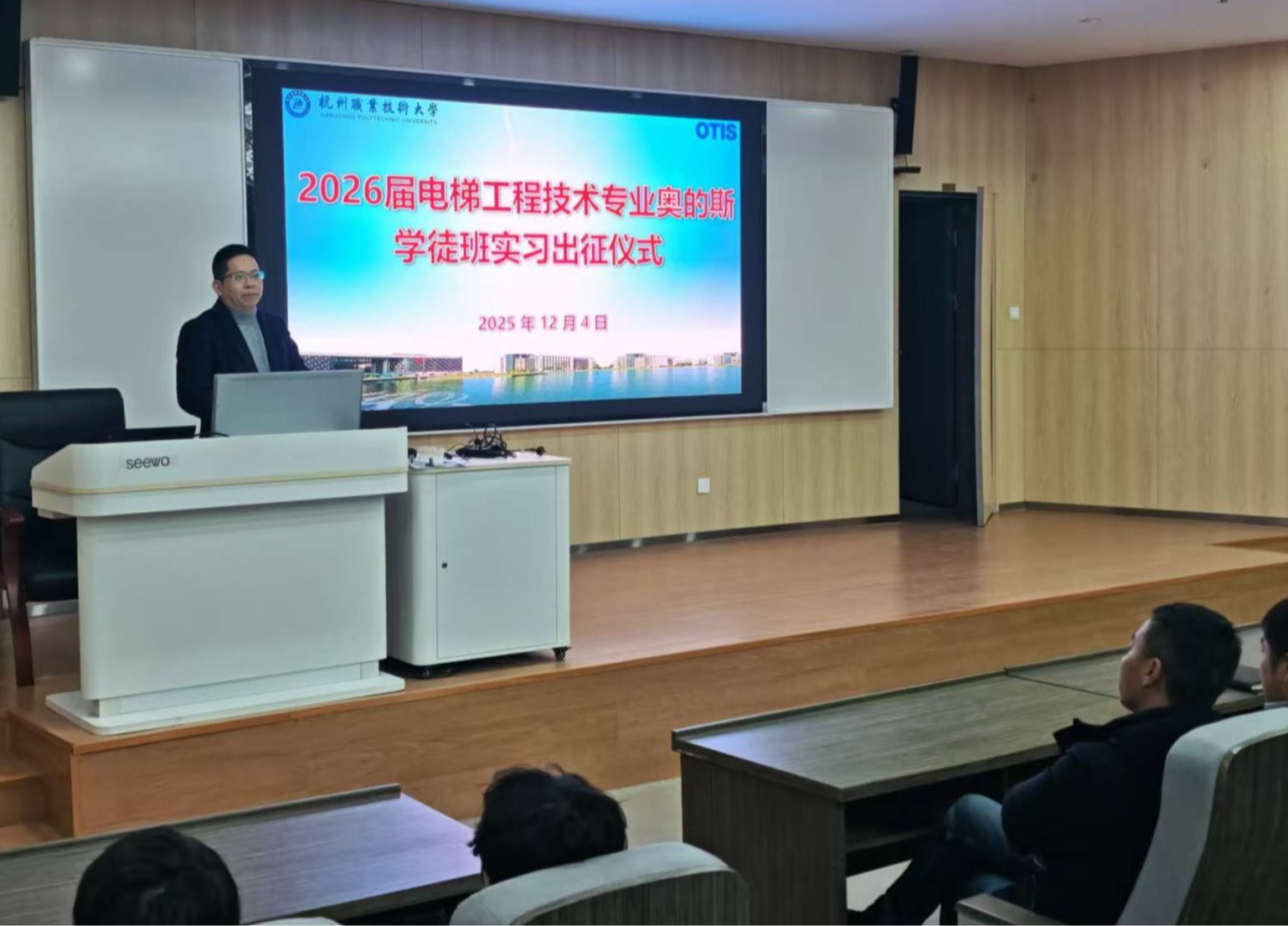 12月4日下午2时,2026届电梯工程技术专业奥的斯学徒班实习出征仪式在5号楼5101教室正式举行。特种设备学院执行院长郭伟刚、省特科院职教发展兼军民融合办主任陈凯清、奥的斯公司相关负责人向秋华、李涛、方晓帆等,以及2026届奥的斯学徒班全体学生与电梯专业教师共同出席。仪式由电梯专业负责人金新锋教授主持。